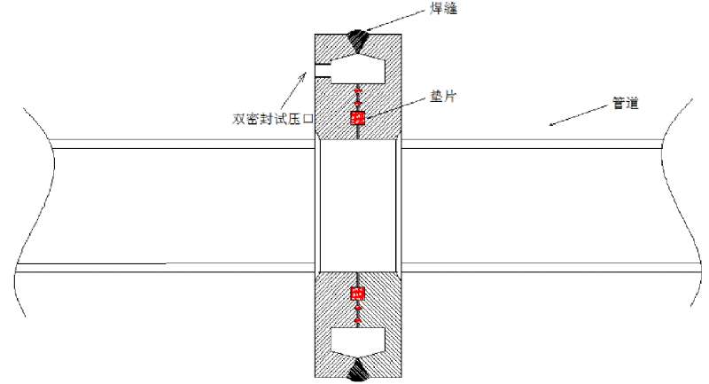 施工準備 → 材料驗收 → 坡口打磨 → 安裝墊片 → 配對雙密封法蘭組對 → 雙密封法蘭加緊 → 打底焊接 → 雙密封預試壓 → 焊縫填充、蓋面 → 焊縫外觀檢查 → 焊縫無損檢測 → 雙密封水壓試驗 →排水、干燥 → 法蘭試壓口封堵 → 管道系統(tǒng)水壓試驗 → 排水、干燥