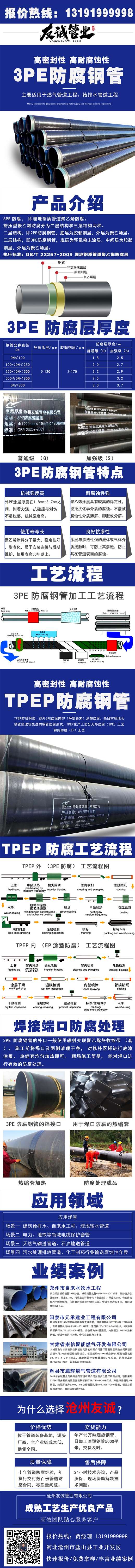第一層環(huán)氧粉末(FBE>100um),第二層膠粘劑(AD)170~250um,第三層聚乙烯(PE)2.5~3.7mm。三種材料融為一體,并與鋼管牢固結(jié)合形成優(yōu)良的防腐層。