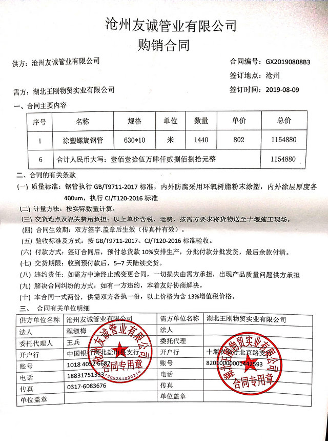 2019年8月9日我公司與湖北王剛物貿實業(yè)有限公司簽署購銷合同,市政管廊工程用DN600涂塑復合鋼管1440米,我公司專業(yè)于涂塑復合鋼管領域,目前國內多地區(qū)的管廊工程建設,給排水管道多用于涂塑復合鋼管,今后我們多重視于產(chǎn)品質量,提高服務